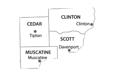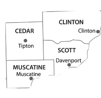 Zip codes in Clinton IA that we cover are Clinton county: 52732, 52060, 52742, 52730, 52069, 52070, 52777, 52323, 52254, 52751, 52037, 52729, 52207, 52731, 52064, 52727, 52750, 52757, 52771, 52774, 52701, 52736, 52733 and 52734; Cedar county: 52776, 52772, 52778, 52358, 52253, 52306, 52320, 52747, 52255, 52216, 52721, 52720, 52765, 52760 and 52337; Muscatine county: 52720, 52739, 52749, 52759, 52760, 52761, 52766, 52769, 52776 and 52778; Scott county: 52722, 52726, 52728, 52745, 52746, 52747, 52748, 52753, 52756, 52758, 52765, 52767, 52768, 52769, 52773, 52801, 52802, 52803, 52804, 52805, 52806, 52807, 52808 and 52809. Please note we do not service the city limits of Davenport, Iowa at this time.